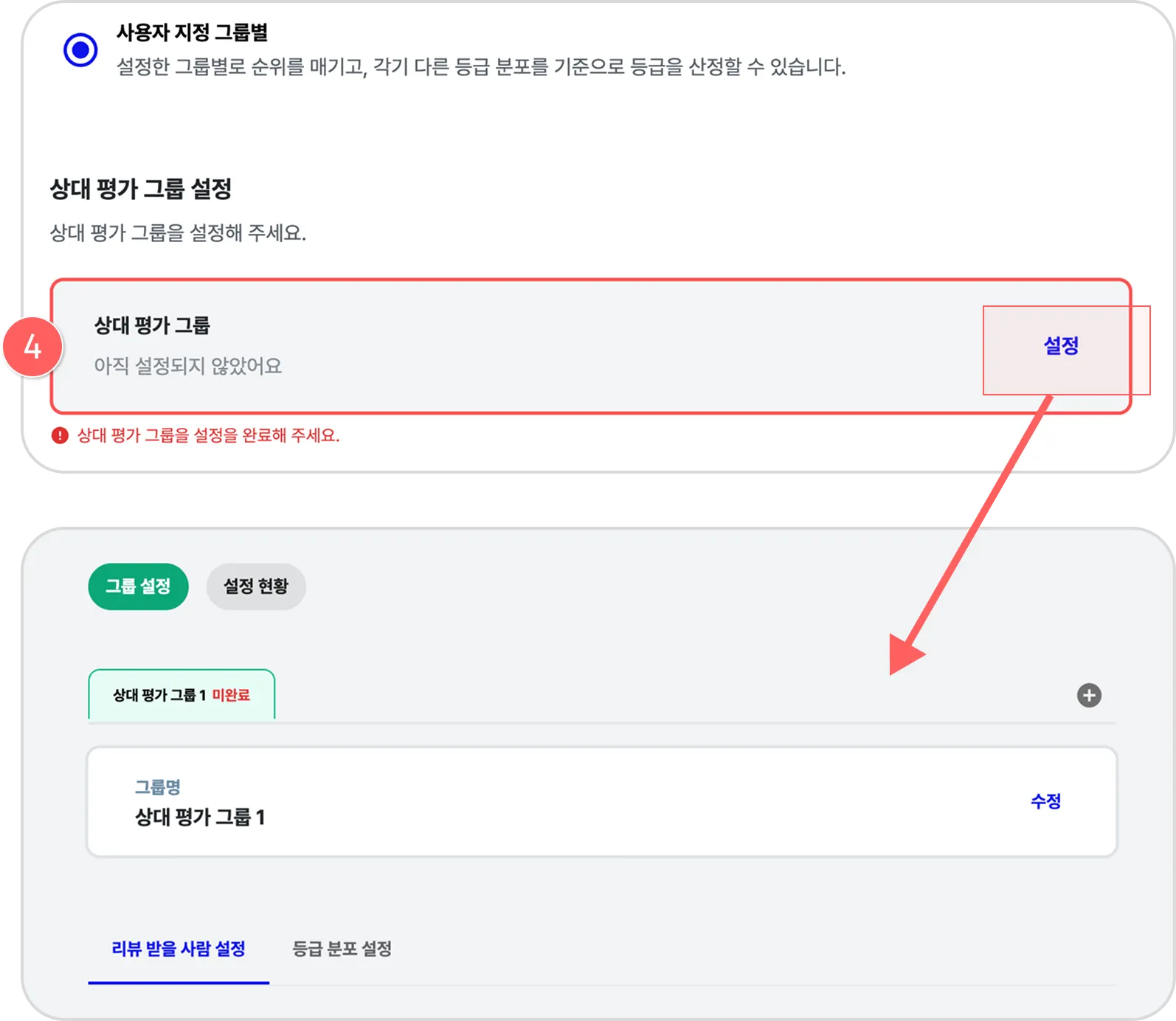 (2) ‘리뷰 받을 사람 그룹’ 섹션의 설정을 눌러 피평가자를 지정해주세요.