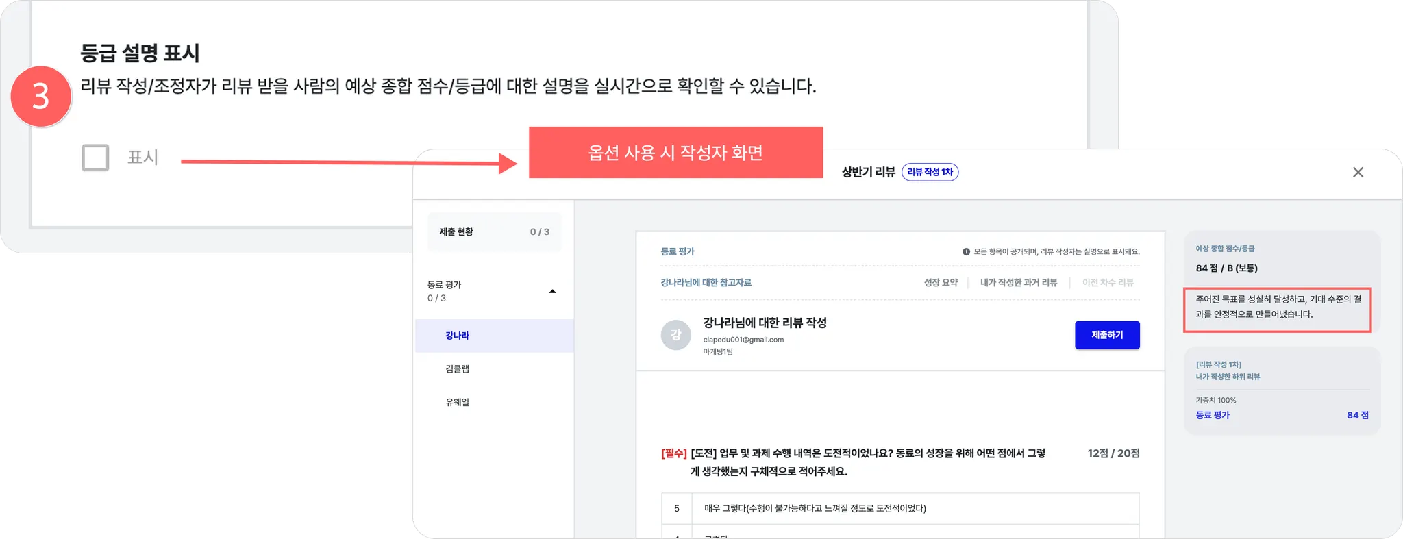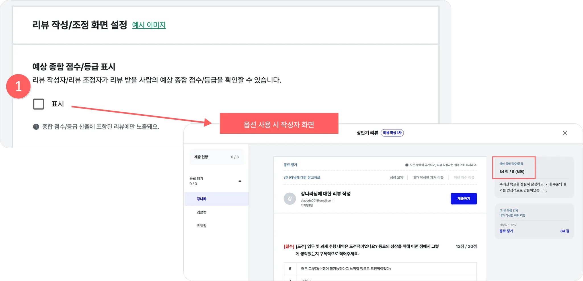 ‘표시’로 선택하면 리뷰 작성자와 리뷰 답변 조정 참여자는 피평가자의 예상 종합 등급을 보면서 리뷰를 작성하거나 조정에 참여할 수 있어요.