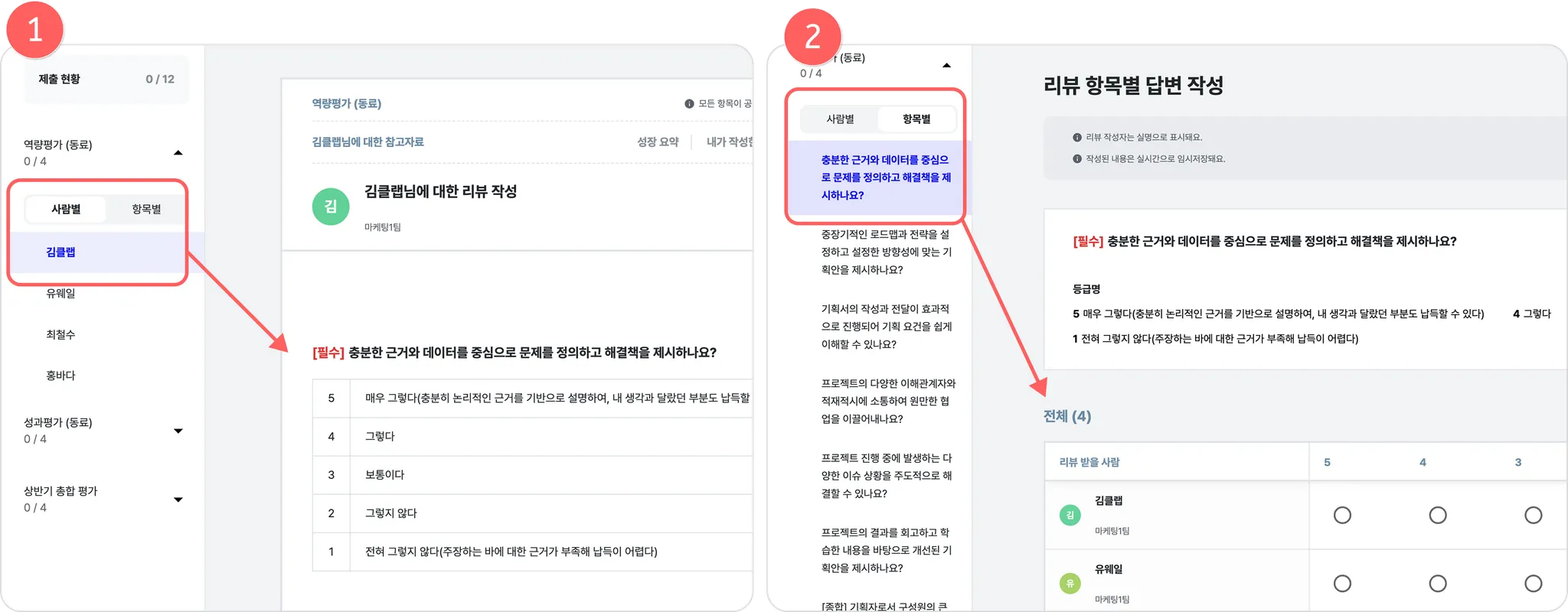 피평가자가 많을수록 항목별 화면을 활용하면 더 효율적으로 작성할 수 있습니다.