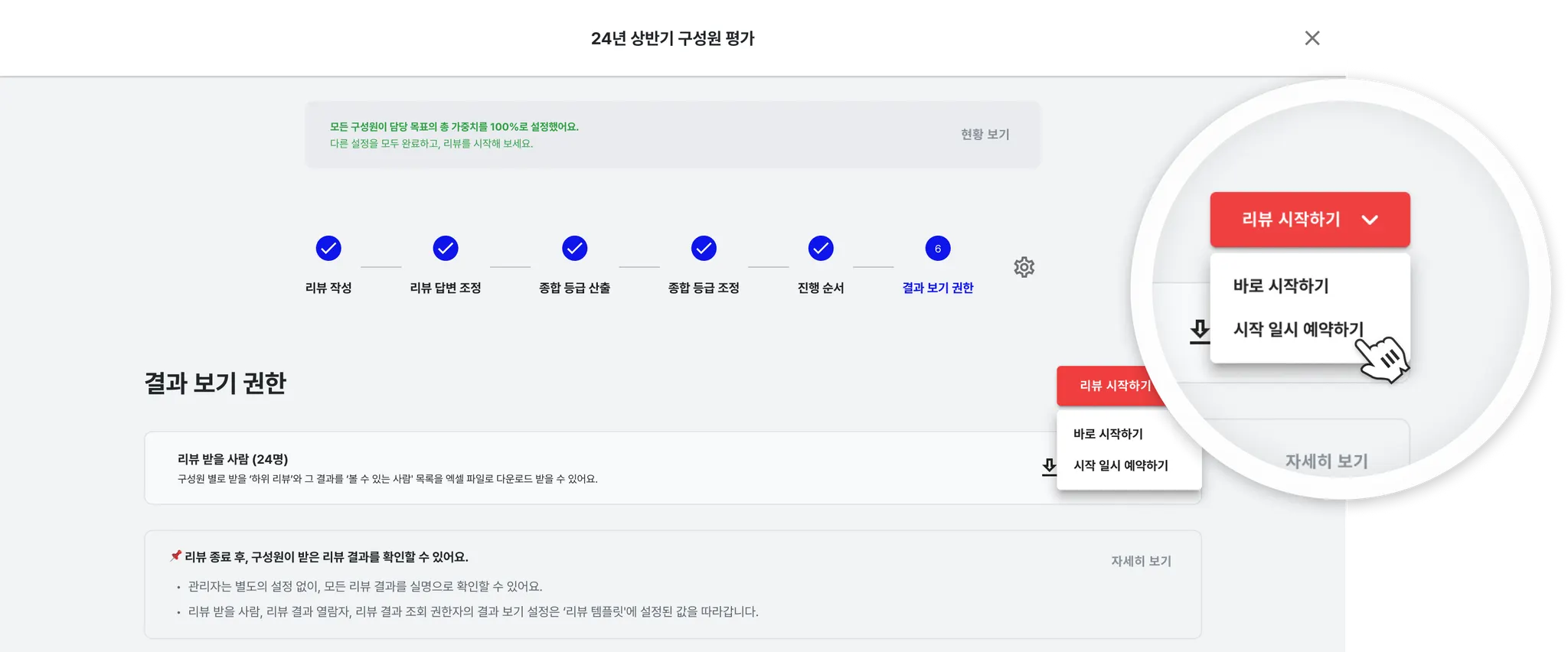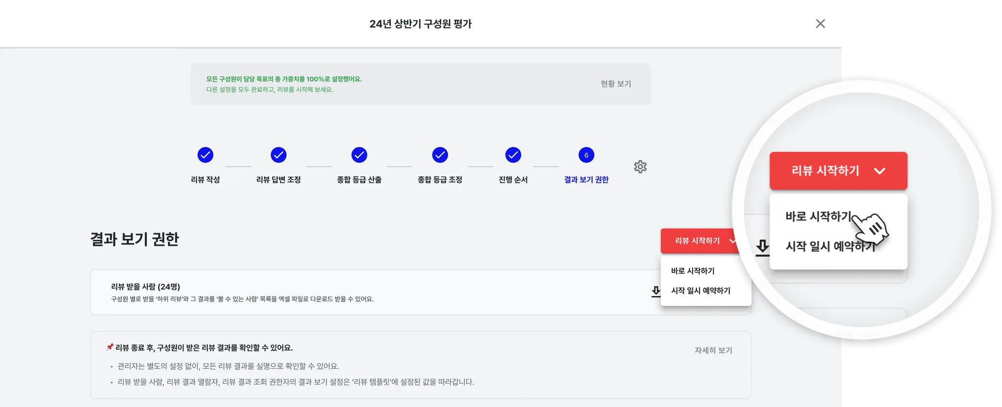 보통 직속 매니저가 담당 팀원의 리뷰 결과를 보도록 설정합니다.