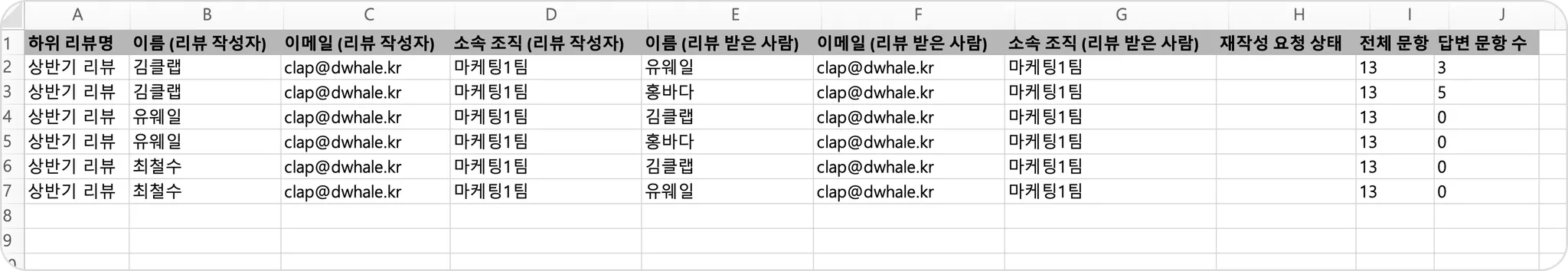 리뷰 받은 사람 (이름, 이메일, 소속 조직)