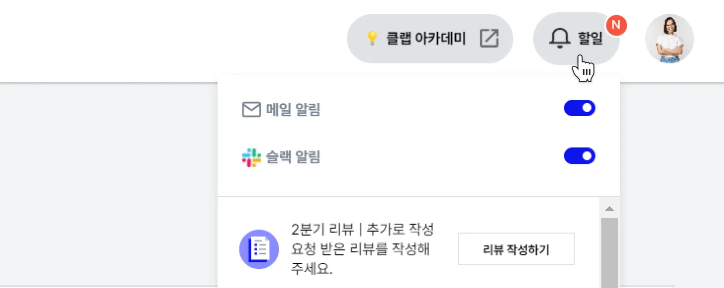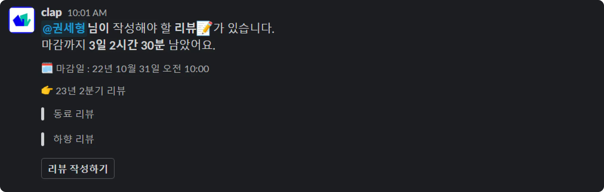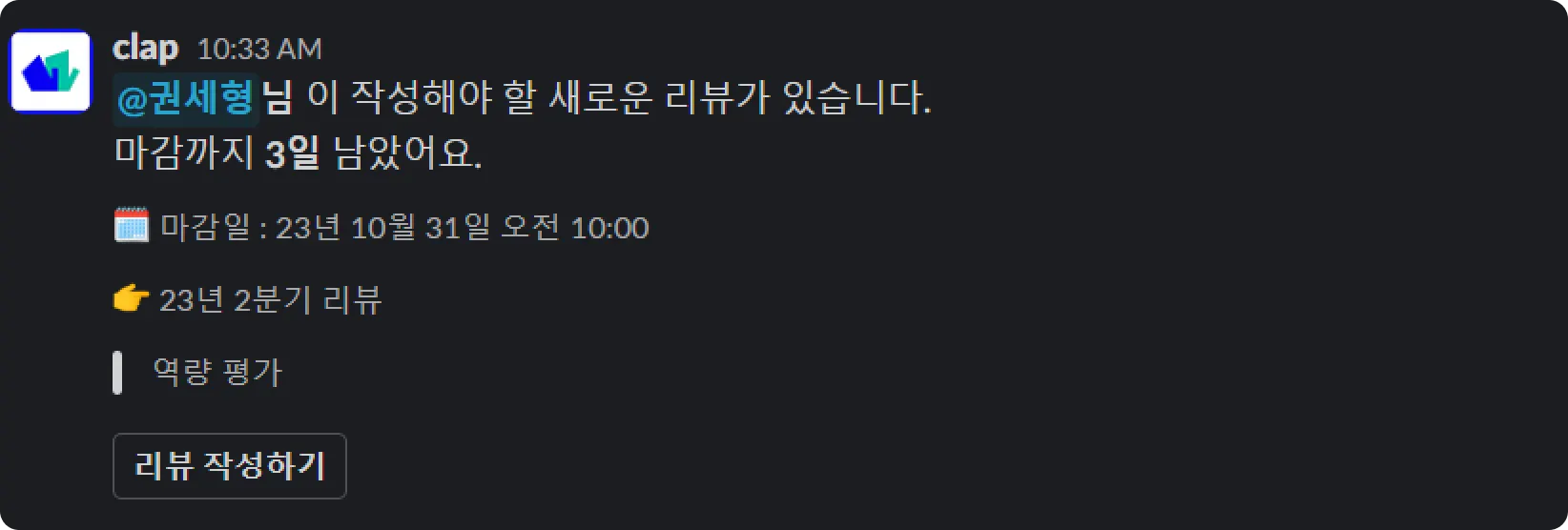 작성 단계가 시작되면 리뷰 작성자로 지정된 구성원은 작성 요청 알림을 받게 됩니다.