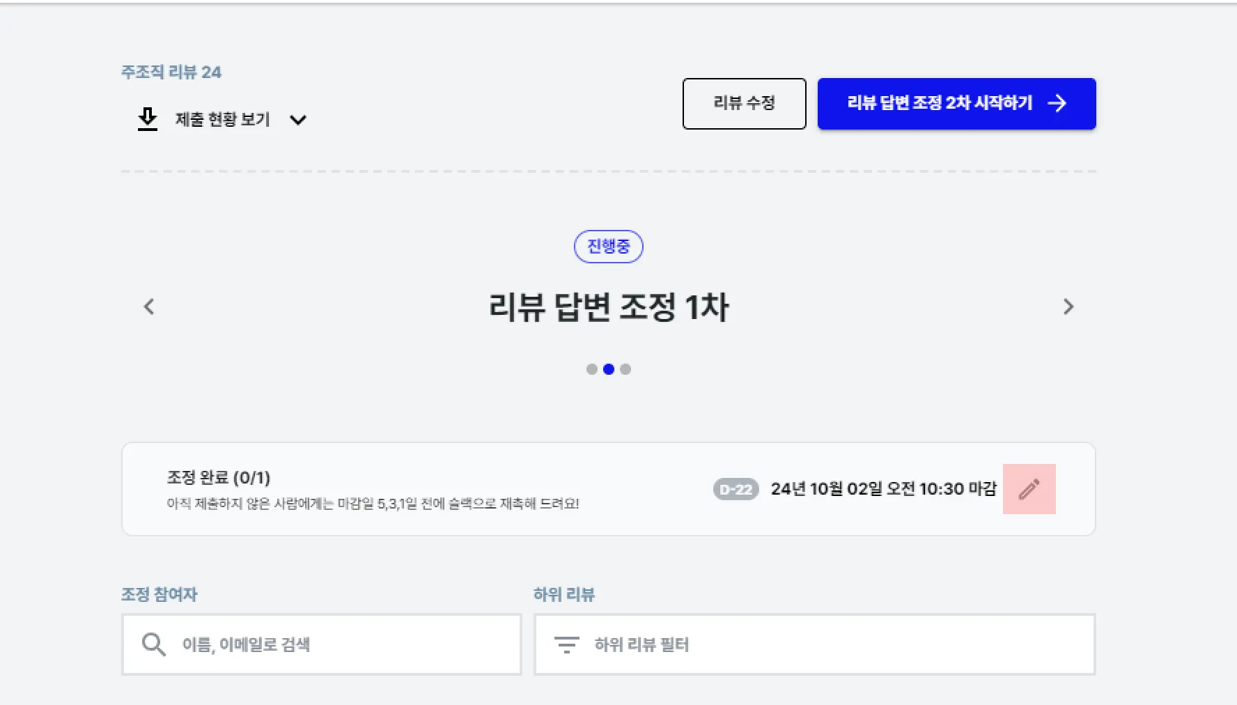 대시보드 상단 좌우 화살표( < > )를 눌러 확인할 차수를 선택합니다. (ex. 리뷰 1차, 2차)