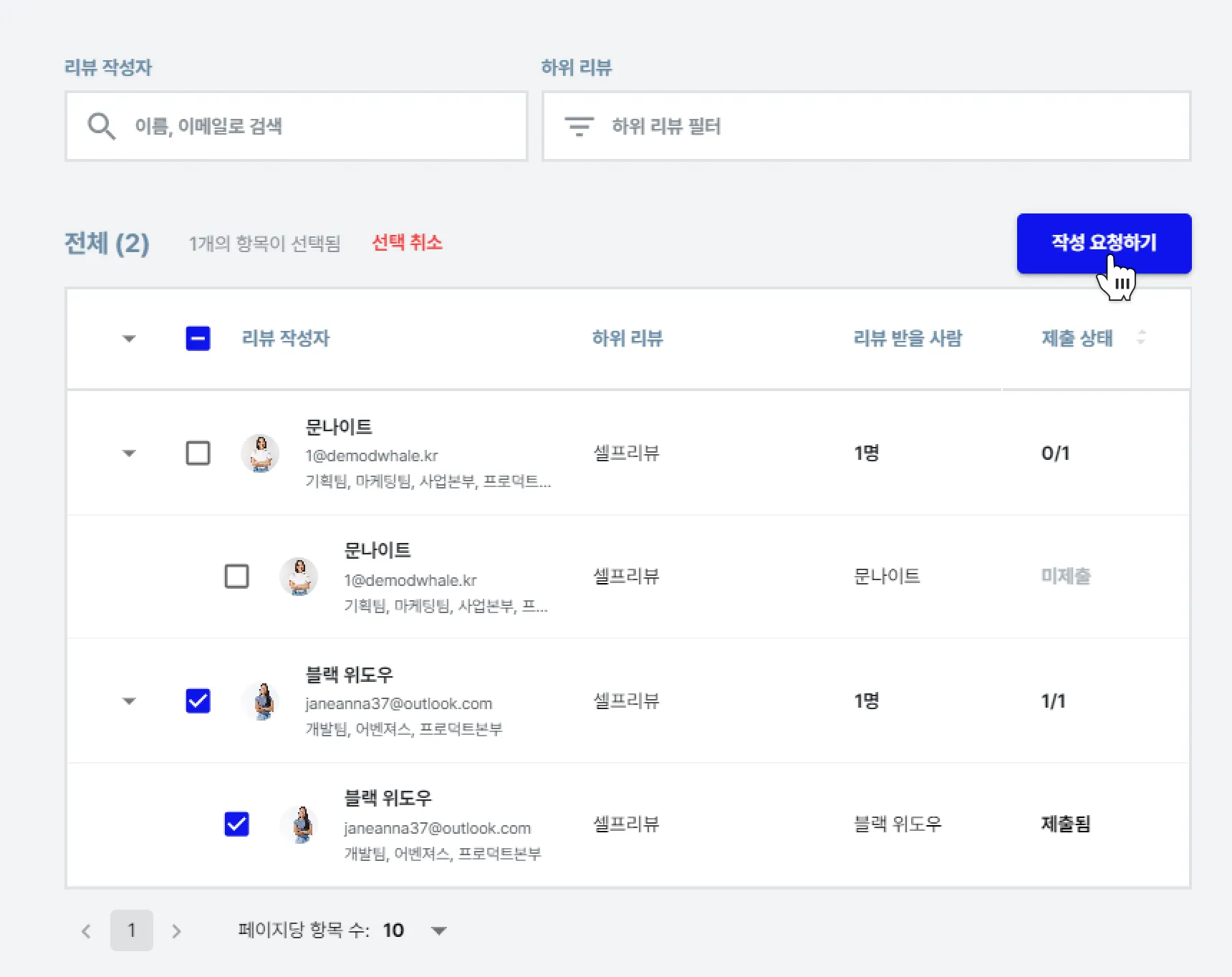 재작성 요청할 리뷰 작성자를 선택해 주세요. (제출 상태: 미제출 / 제출됨 모두 가능)