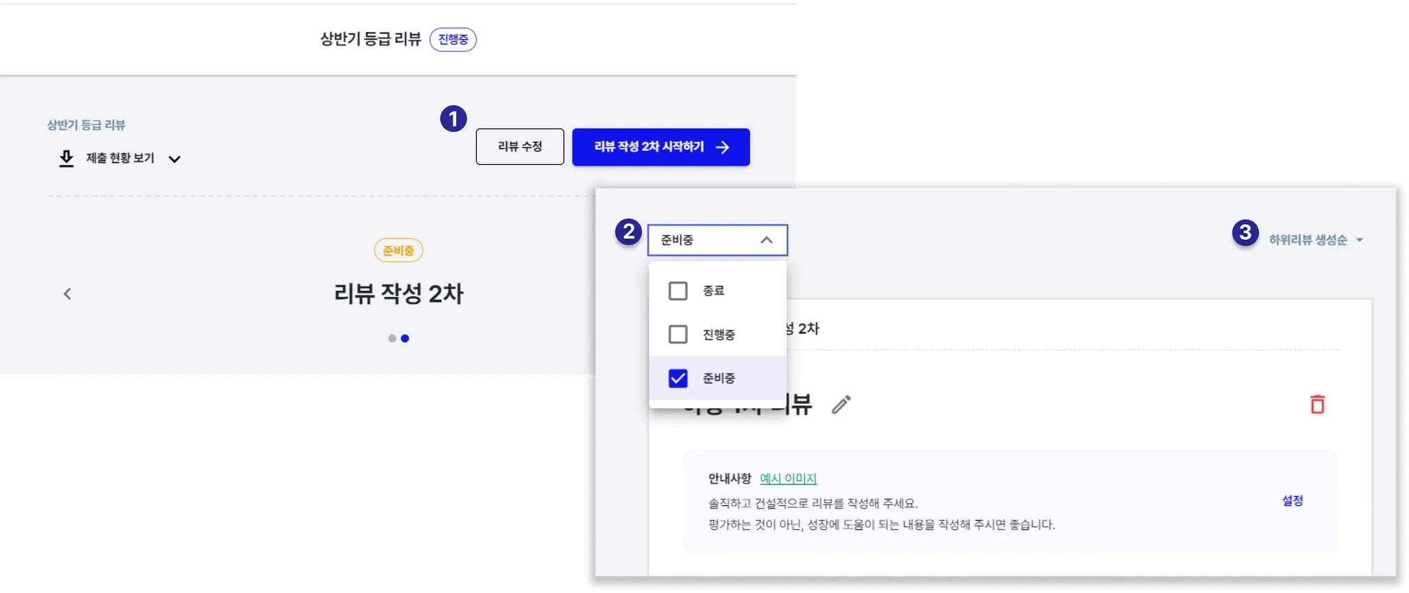 *종료: 리뷰 작성 단계이나 해당 작성 차수만 종료된 상태 (ex. 리뷰 2차 진행 중일 때 종료된 리뷰 1차)