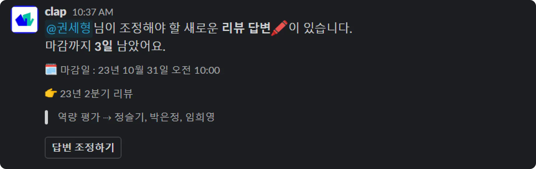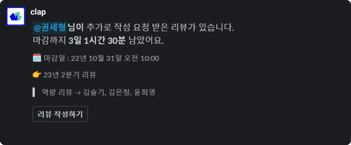 제출된 리뷰를 반려하면 리뷰 작성자에게 재작성 요청 알림이 발송됩니다. (슬랙/이메일)