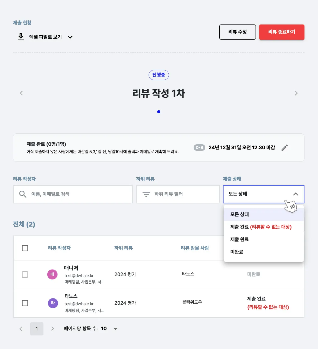 제출 상태 필터: 제출 상태(미제출,제출완료), 평가자가 ‘리뷰할 수 없는 대상’으로 선택한 현황을 확인할 수 있습니다.