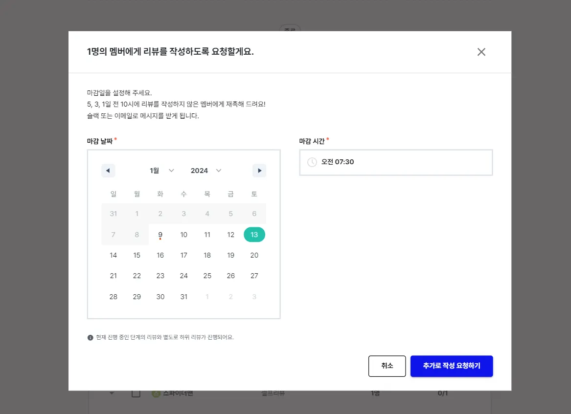 마감 기한을 지정 한 후 [ 추가로 작성 요청하기 ] 를 눌러주세요.
