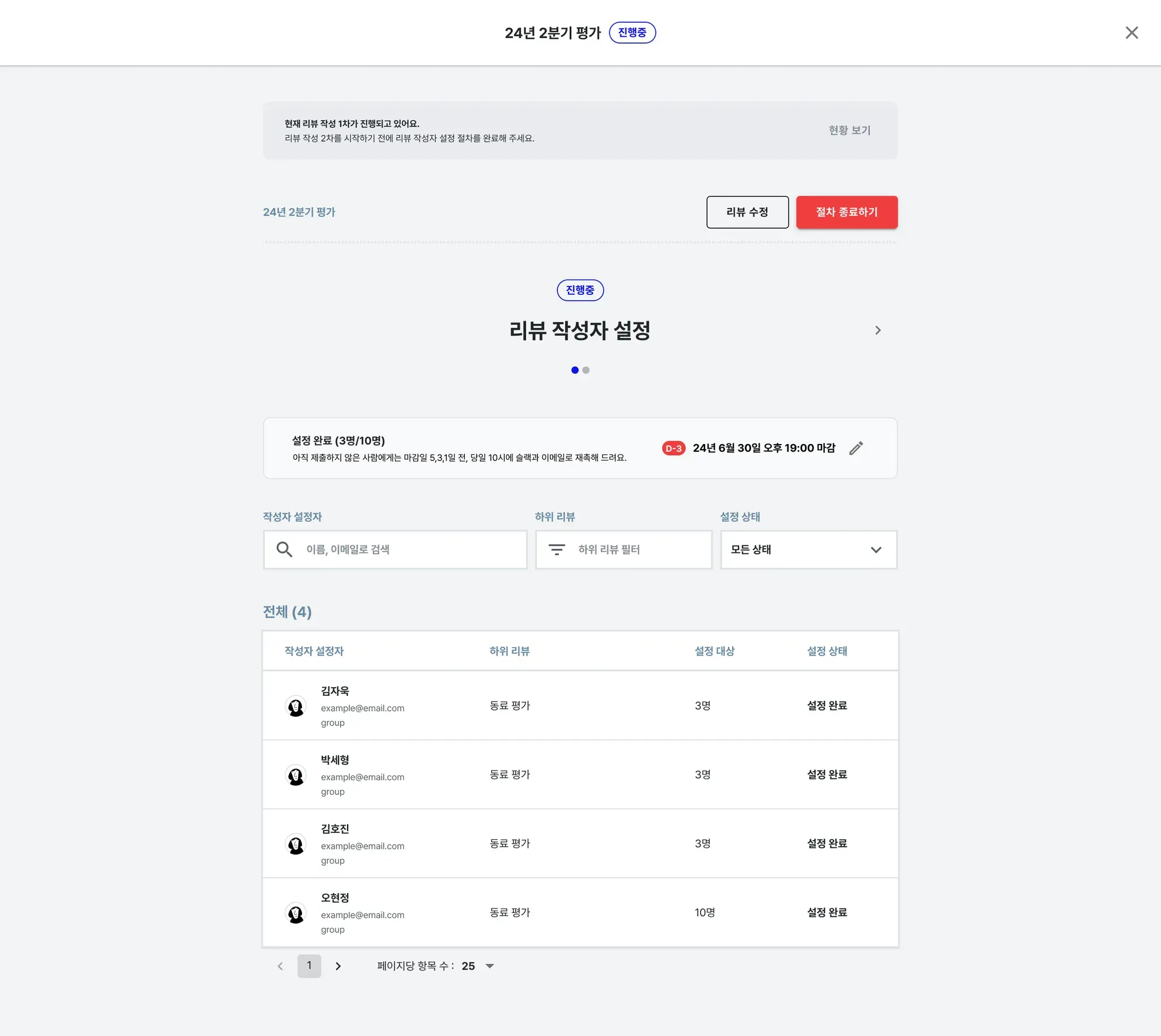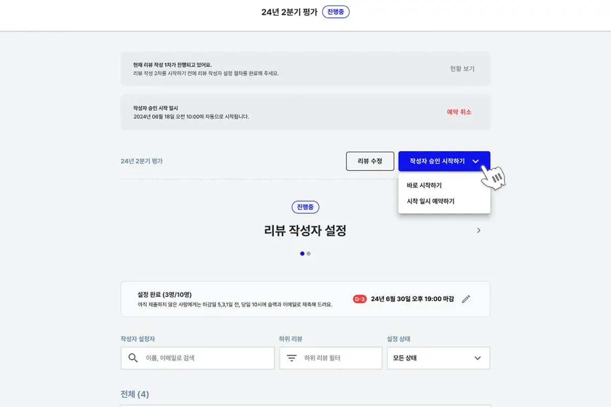 진행 중인 리뷰 선택 후 [리뷰 수정] > [리뷰 작성자 설정] > [제출 현황] 탭에서 ‘리뷰할 수 없는 대상’으로 선택한 평가자를 삭제하거나, 다른 평가자로 변경할 수 있어요.