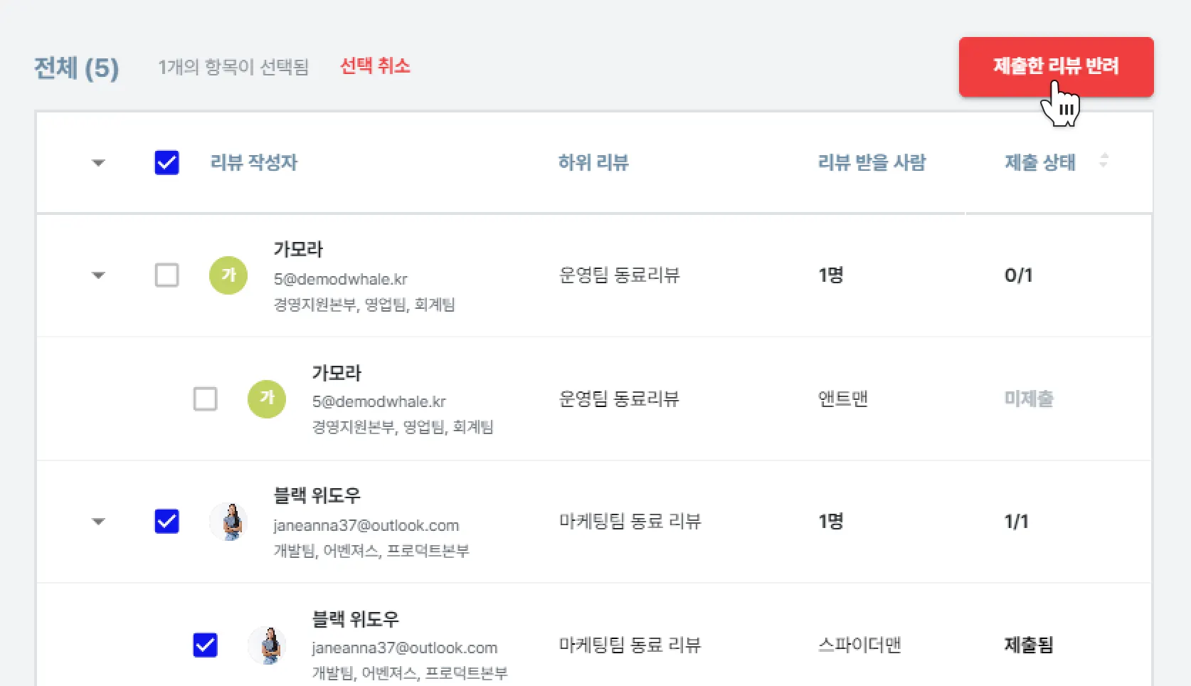 메뉴: [제출 상태: 제출됨]의 체크박스 선택 > [제출된 리뷰 반려] 버튼 클릭