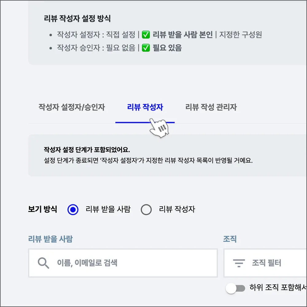 화면 경로: 화면 우측 상단 [리뷰 수정] → 리뷰 작성자 설정 ‘설정’ → ‘작성자 설정자/승인자’ 탭 클릭