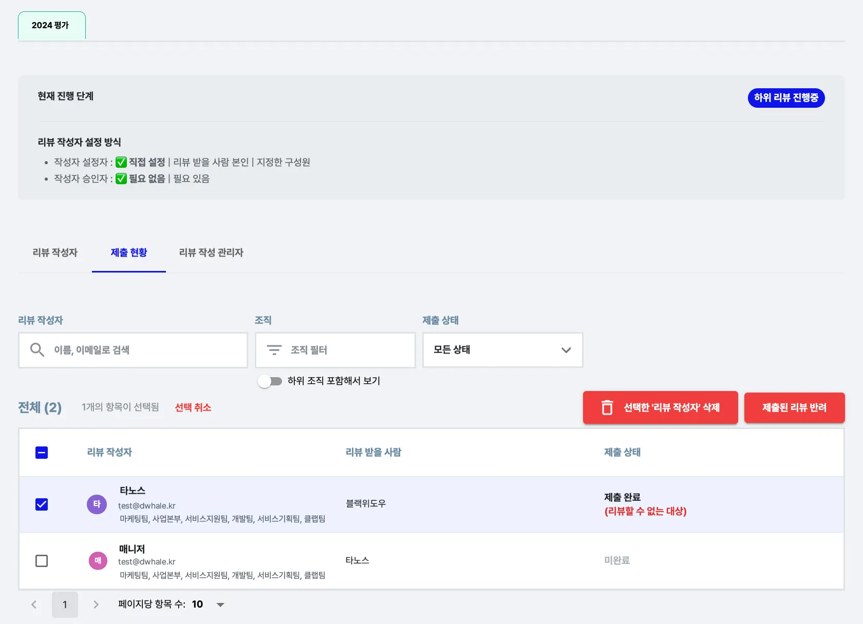 하위 리뷰 필터: 하위리뷰별 제출 현황을 파악할 수 있는 정보가 제공됩니다.