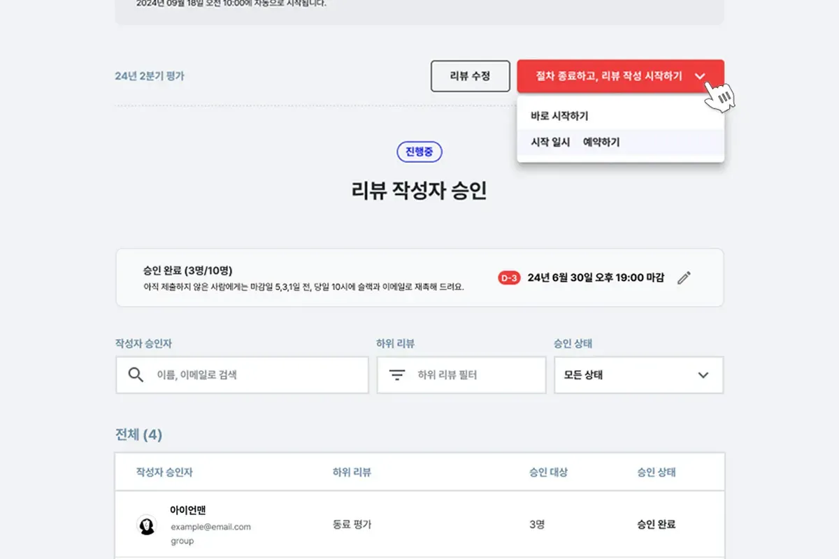 화면 경로: [평가] → [평가 관리] → ‘작성자 승인’ 단계의 리뷰를 클릭해 주세요.