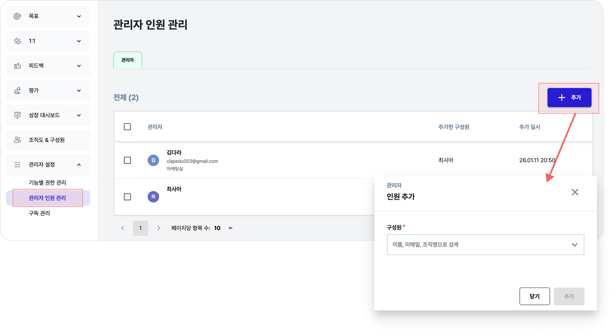 화면에서 [+추가]버튼을 눌러 관리자로 등록하고 싶은 구성원을 추가할 수 있어요.