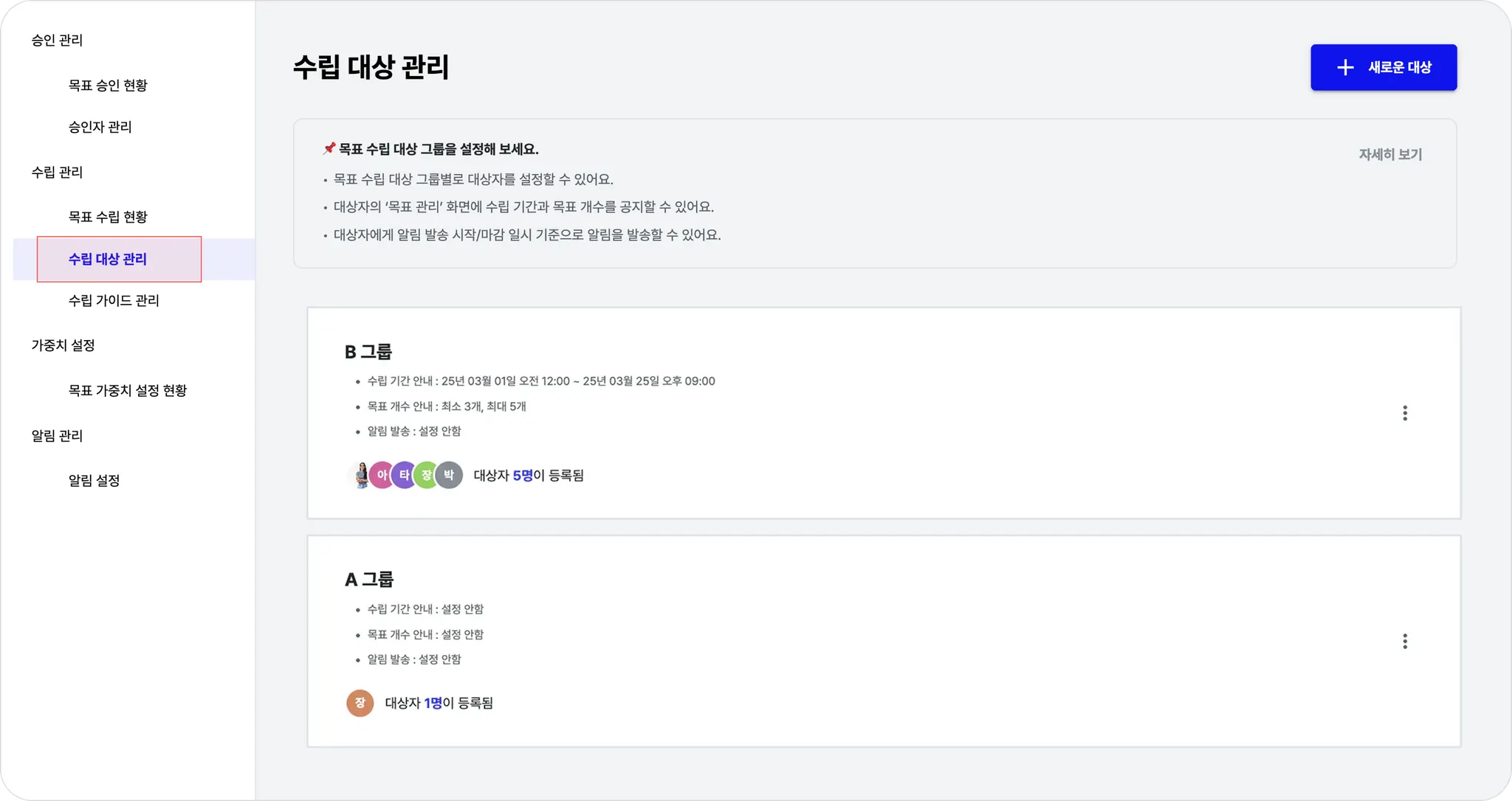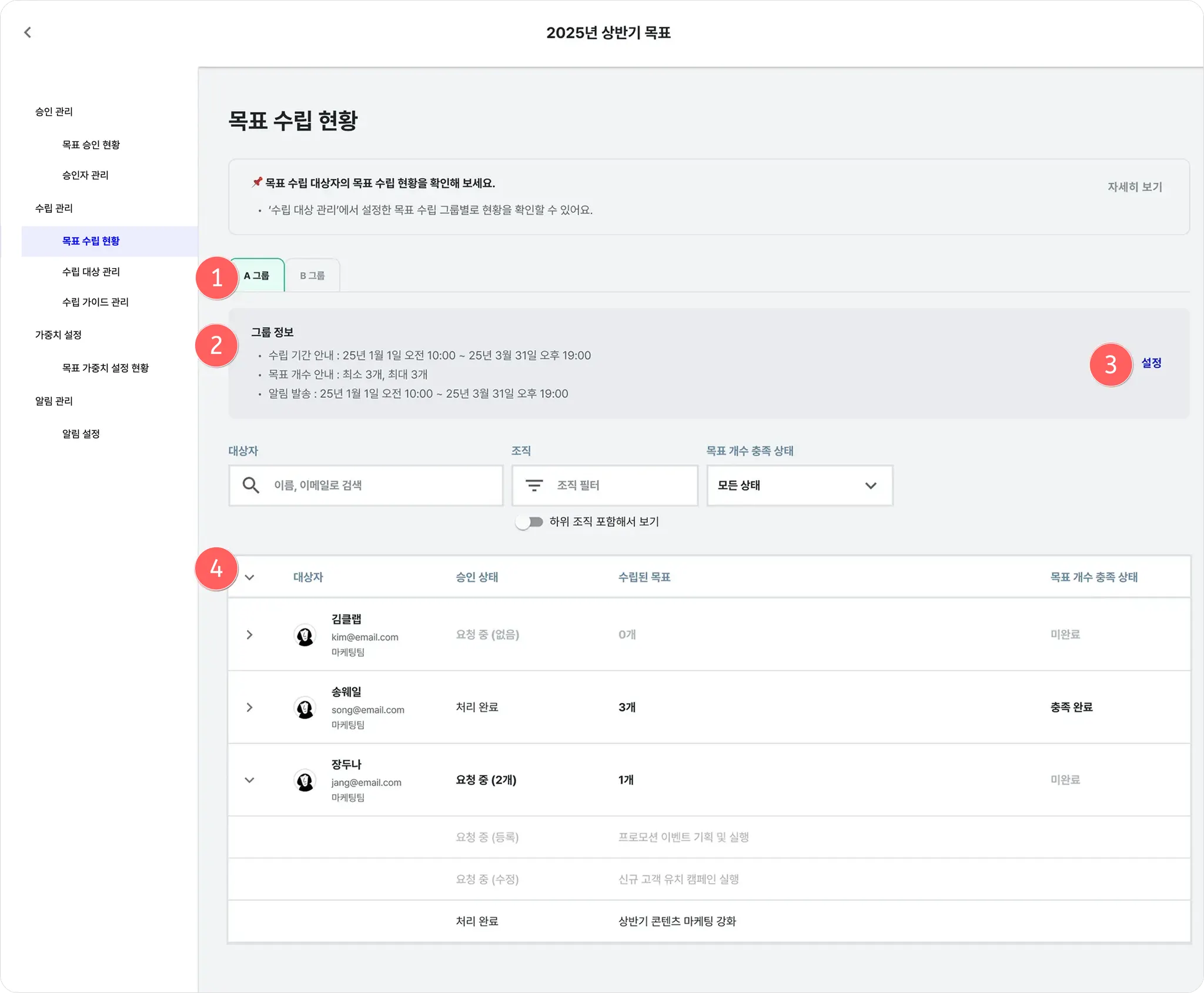 (4) 그룹에 지정된 대상자들의 목표 설정 현황을 확인할 수 있습니다.