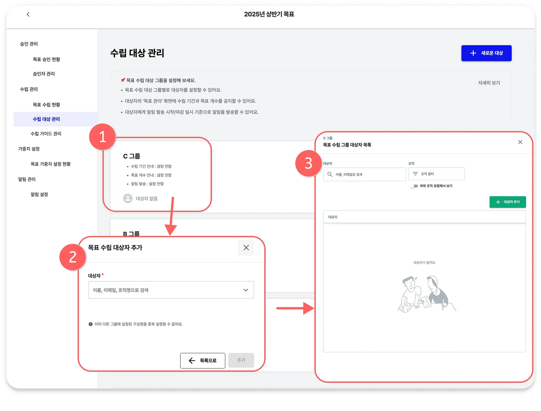 목표 수립 그룹을 생성하고 대상자를 추가할 수 있습니다.