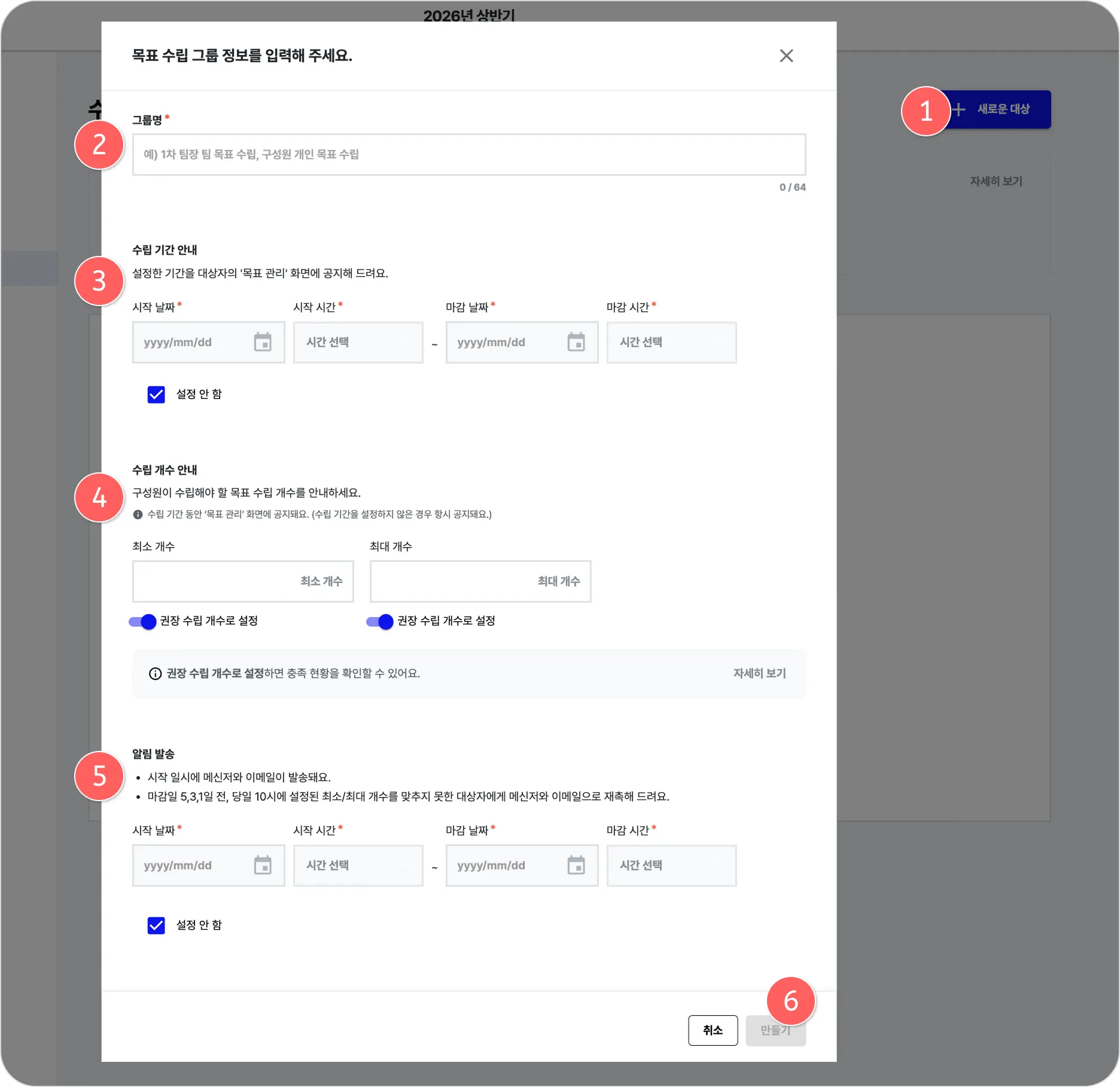 특정 기간 동안 목표 설정을 진행하고, 목표의 최소/최대 개수 등 그룹 기능을 활용해